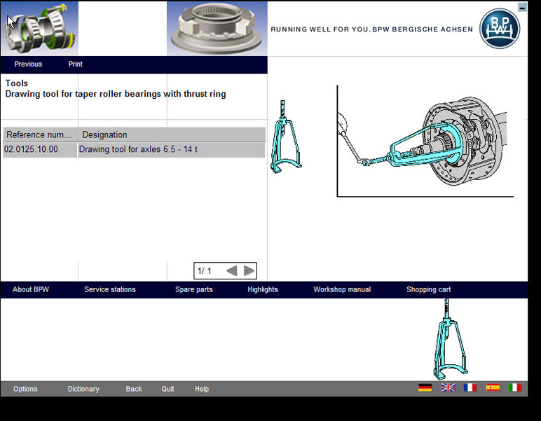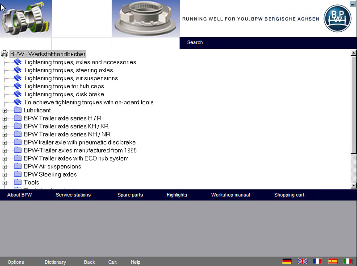 В каталоге BPW есть поиск по данным таблички моста, по группе продуктов, по оригинальному номеру детали, по типу моста, так же есть информация об интервалах и описания регламентных работ, регулировочные и настроечные параметры, моменты затяжки резьбовых соединений, смазочные работы и замена накладок.