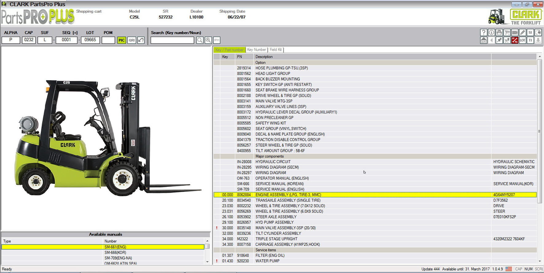 Интерфейс каталога запчастей Clark PartsPROPlus Fork Lift очень простой и удобный, есть поиск по модели, серийному номера, перечень применяемости детали, так же доступны сервисные бюллетени.