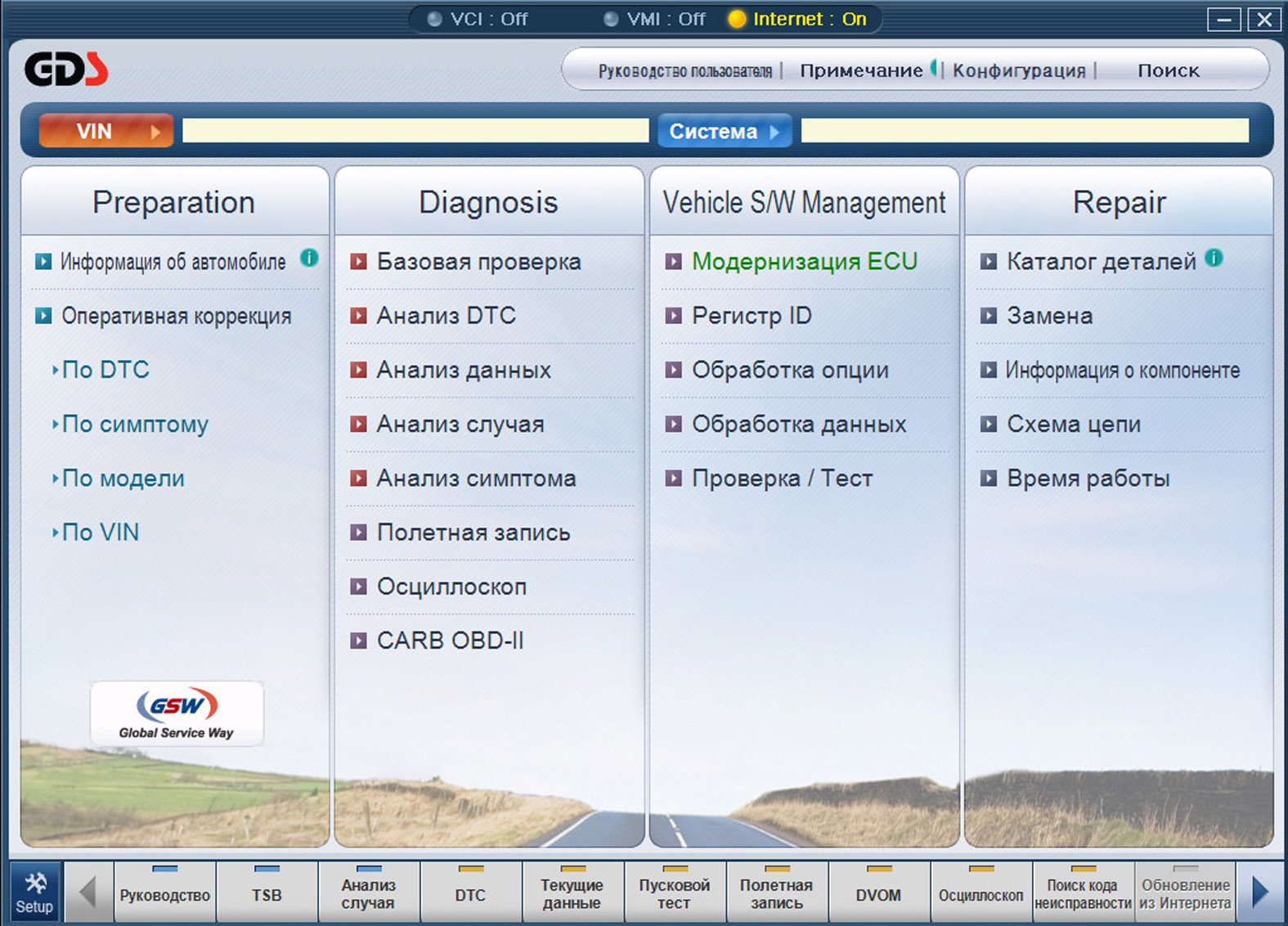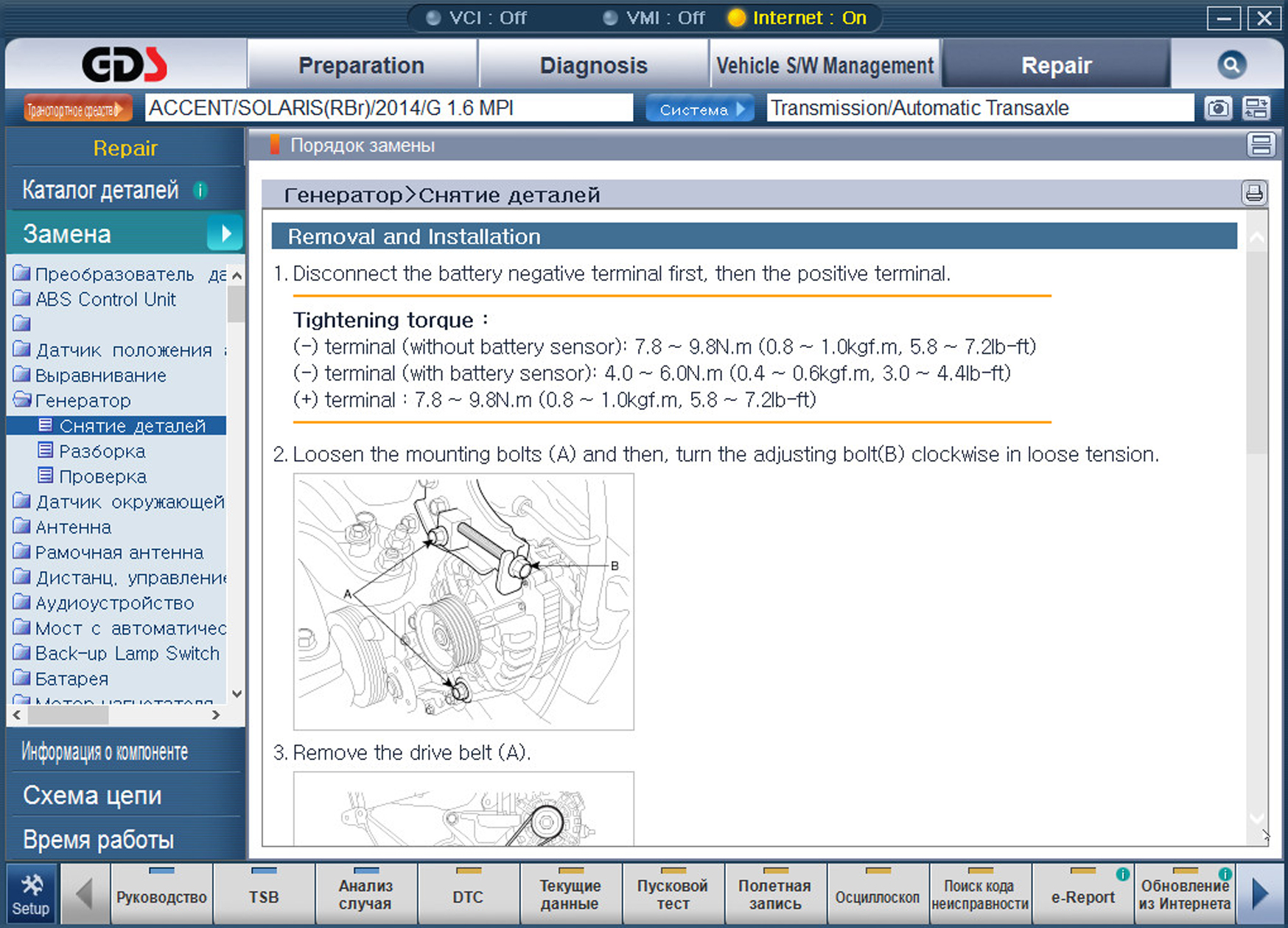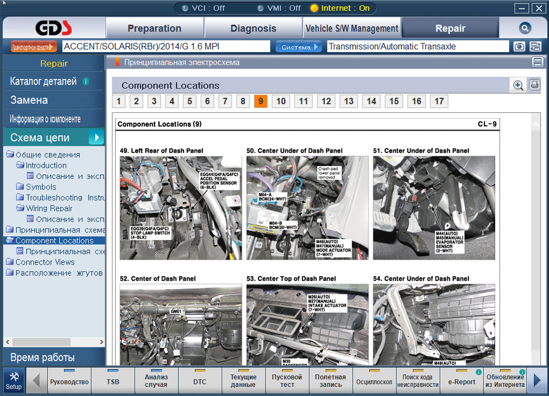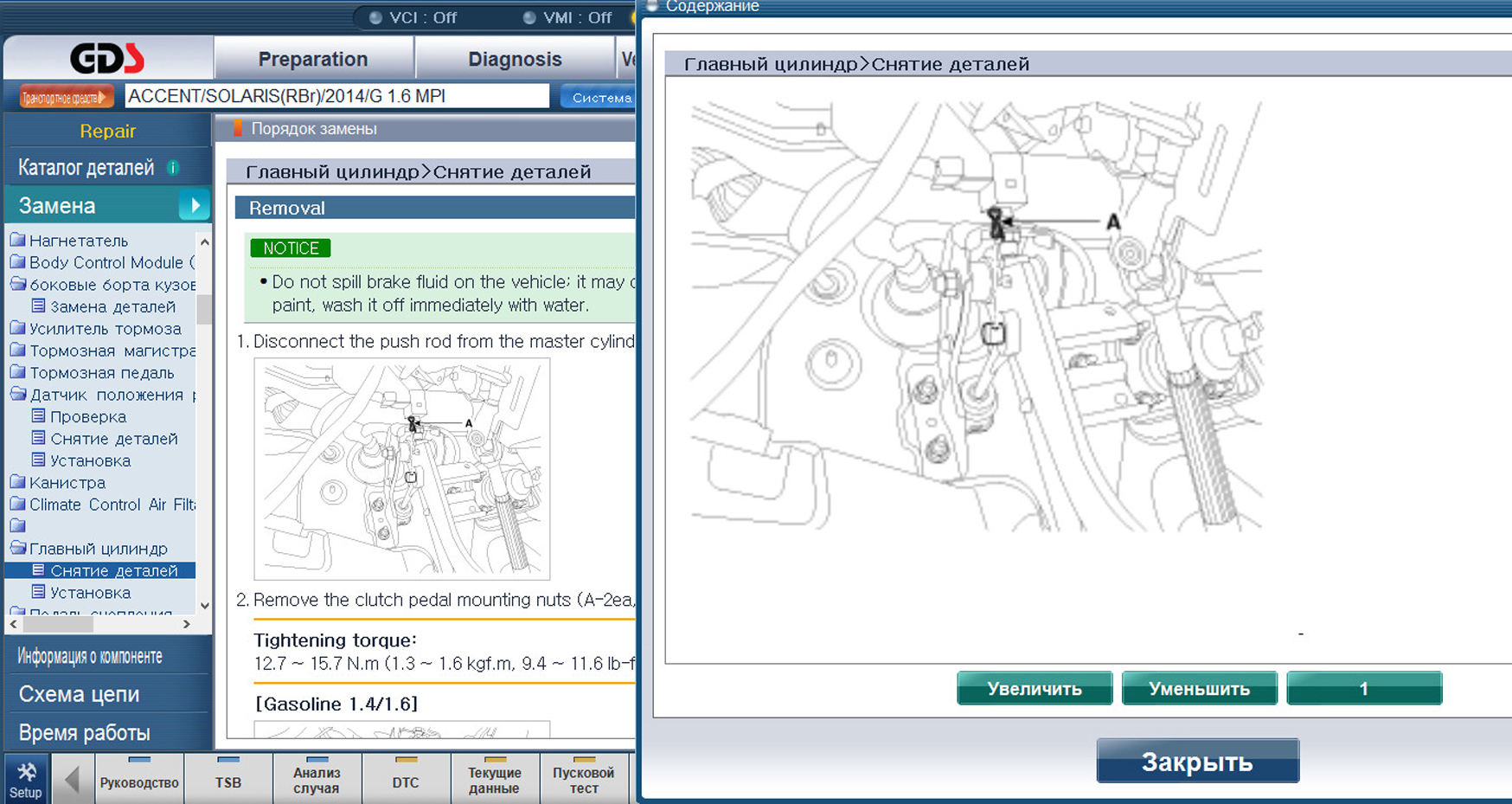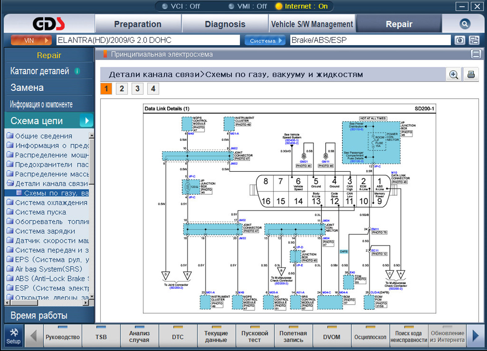 В каталоге по ремонту Hyundai GDS представлена информация по ремонту и диагностике, разборке, сборке, регулировке и настройке всех узлов и агрегатов автмобилей корейской марки Киа, представлены электросхемы Хундай, распиновка разъёмов, расшифровка диагностических кодов неисправностей DTC (Daignostic Trouble Codes), моменты затяжки, технические данные, дилерская информация по ремонту и диагностике механических МКПП и автоматических АКПП трансмиссий Хендай, необходимый специальный инструмент, а так же другая полезная информация для ремонта автомобилей марки Hyundai.