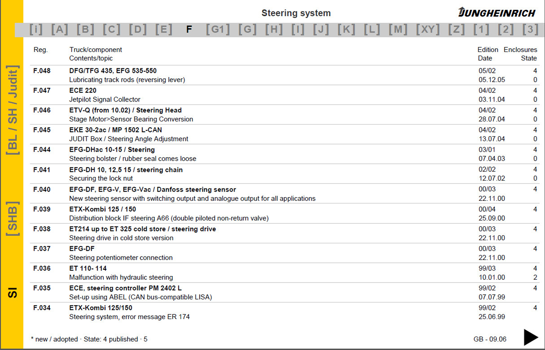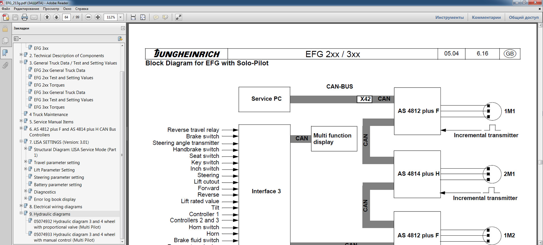 JUNGHEINRICH service manuals содержит пошаговые инструкции по ремонту различных элементов систем, электросхемы, схемы расположения компонентов электрооборудования, распиновка разъемов, гидравлические схемы,