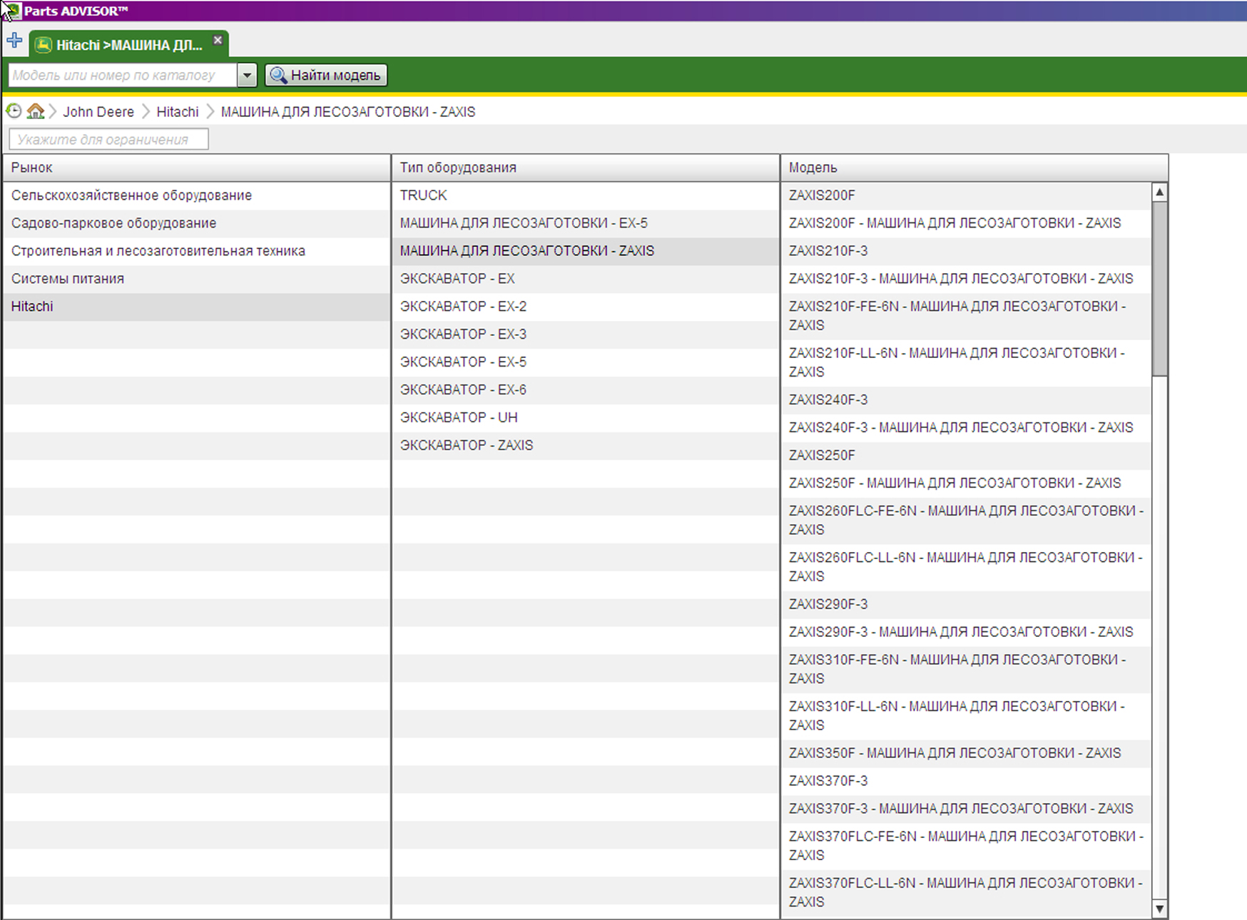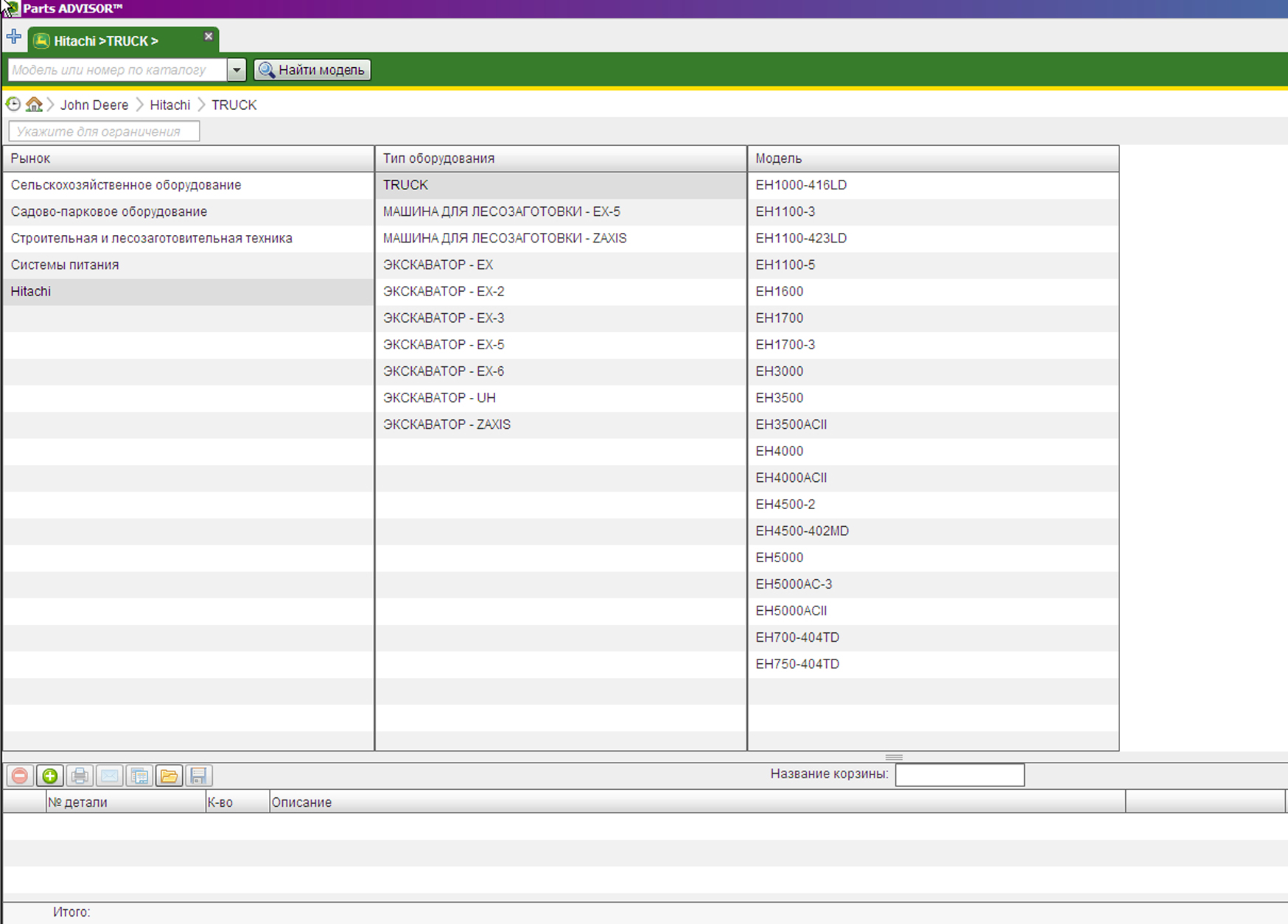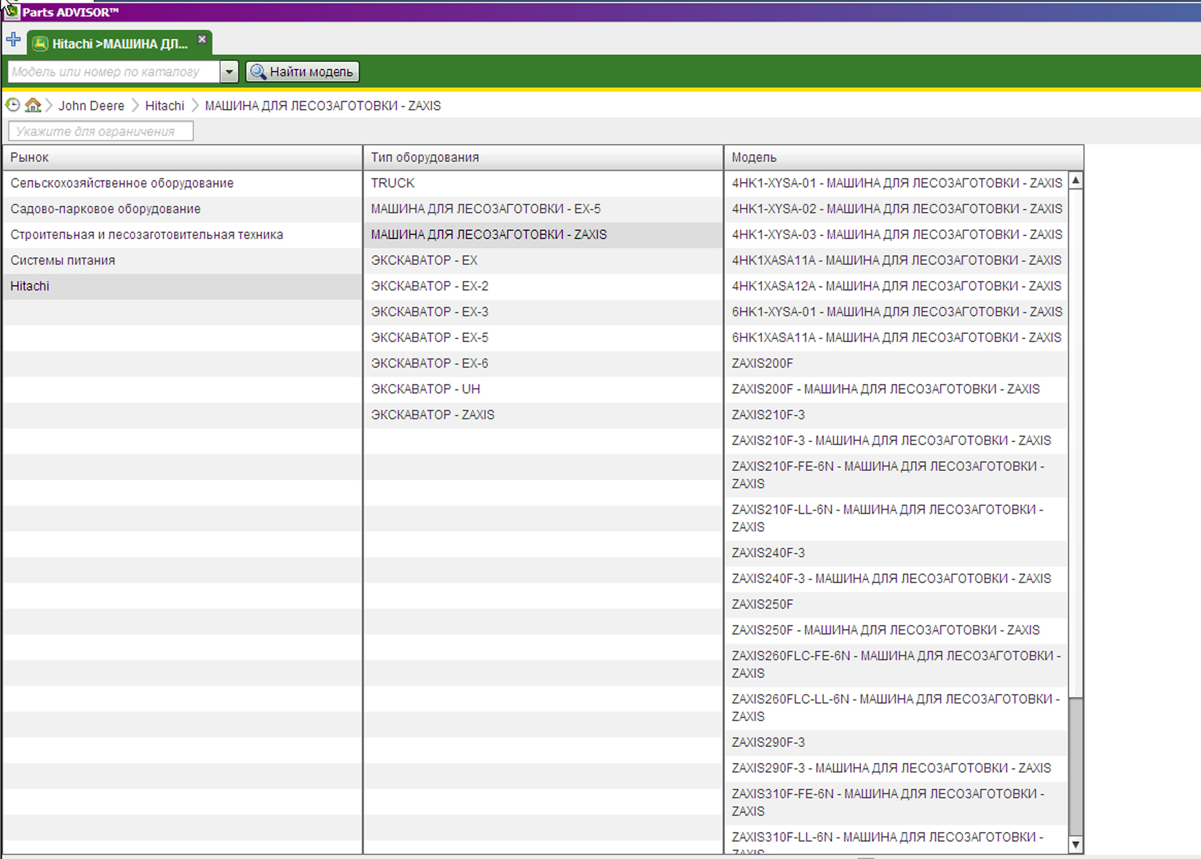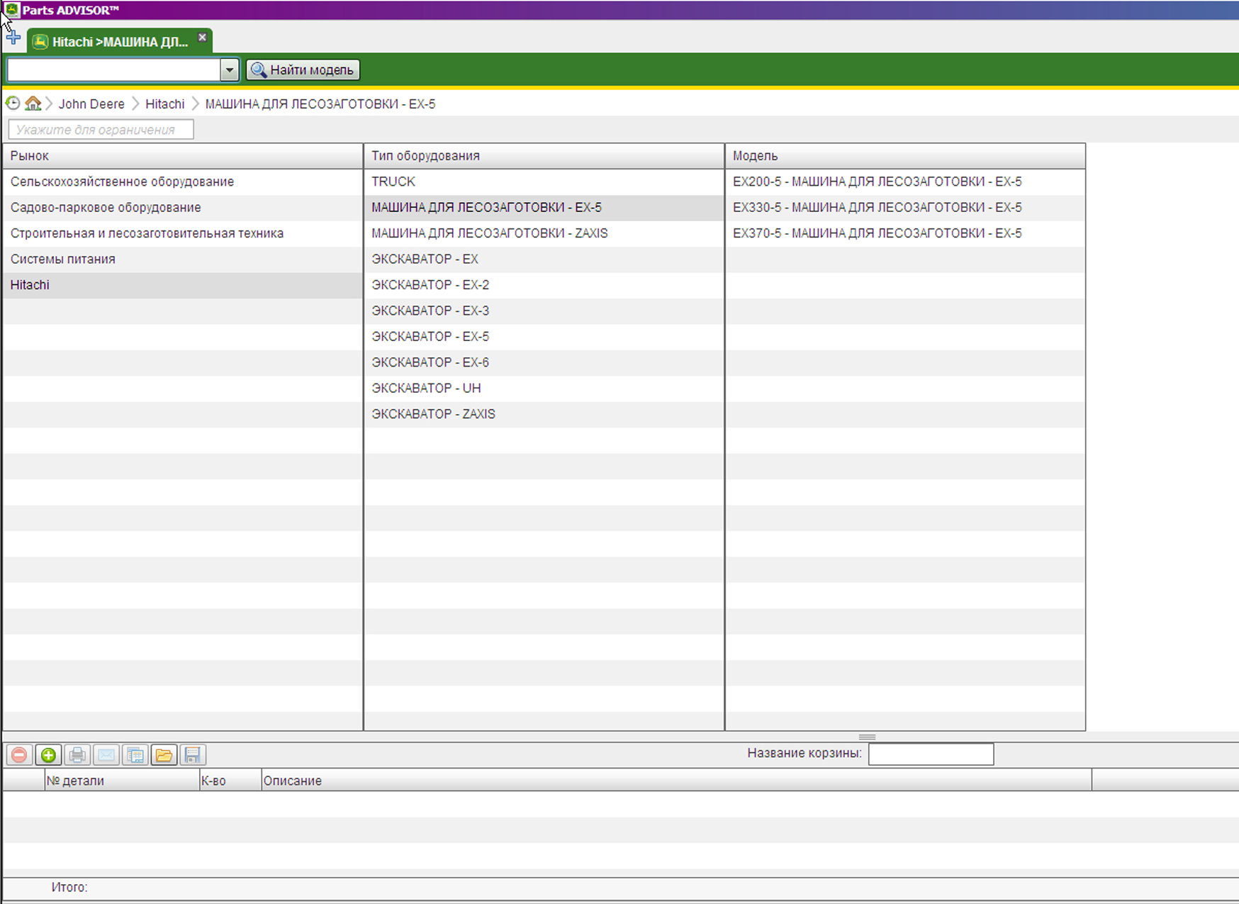 Пример работы с каталогом запчастей John Deere & HITACHI: