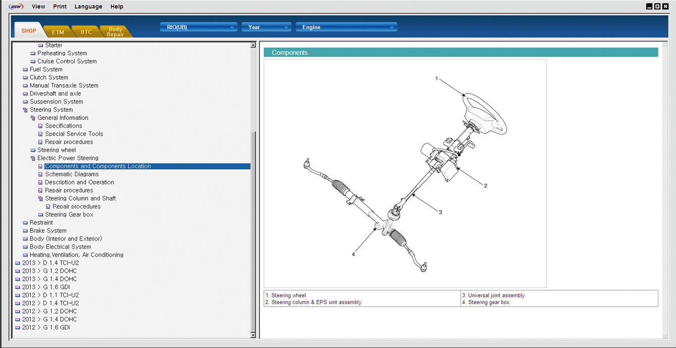 Kia GSW - Дилерская техническая документация содержит описание конструкции и устройства, характеристики, инструкции по ремонту и обслуживанию всех узлов и агрегатов, электрические схемы, инструкции по диагностике и много другой полезной информации. Программа очень похожа на Kia GDS