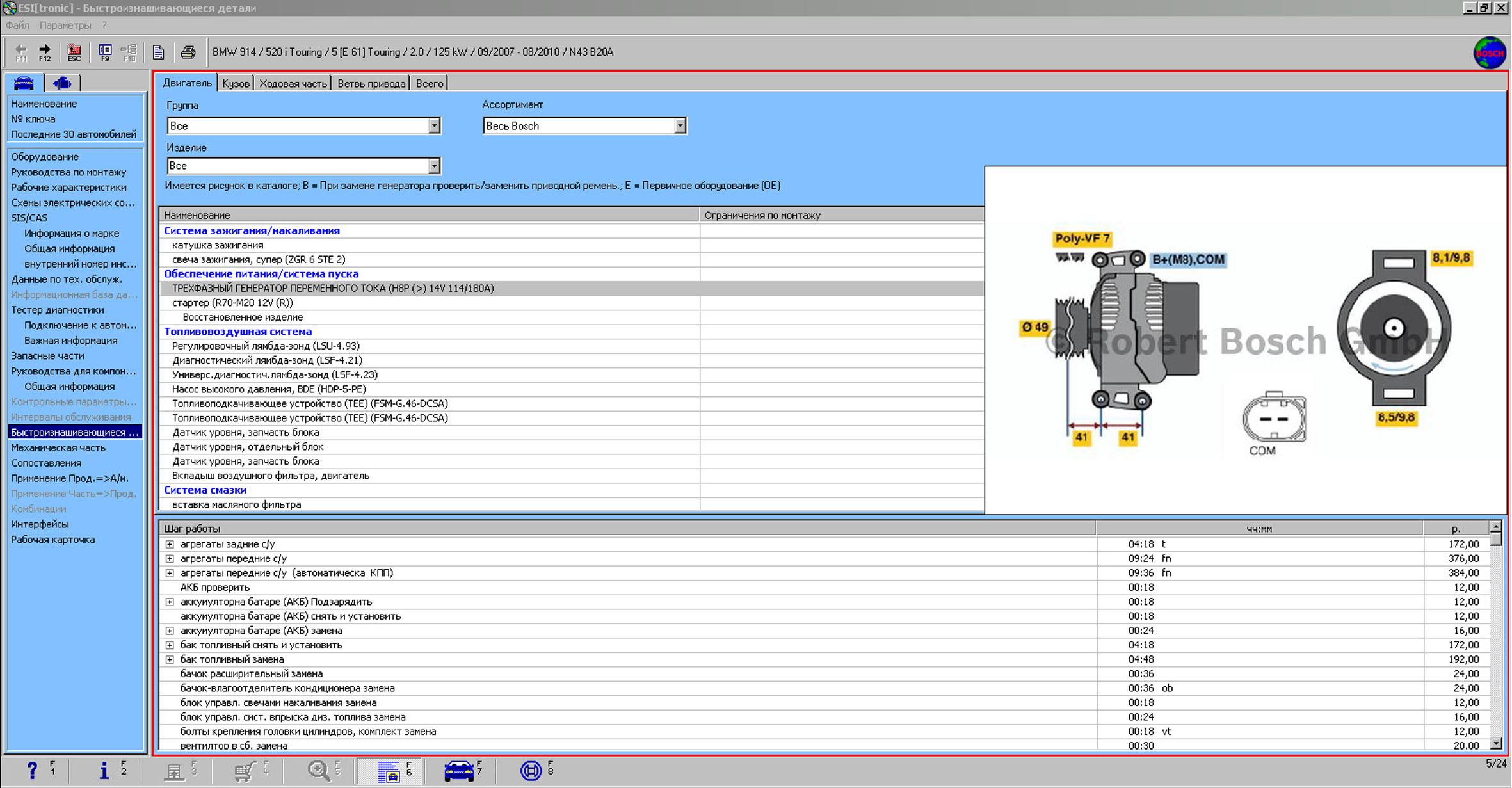 Каталог Bosch ESI содержит каталог запчастей о всей продукции Бош, руководство по ремонту авто, электросхемы авто, нормо часы Каталоге Bosch ESI tronic содержиться информация об автомобильных запасных частях, нормо-часах, юстировочных данных ТНВД (топливных насосов высокого давления), программы для работы с блоками диагностики фирмы BOSCH,