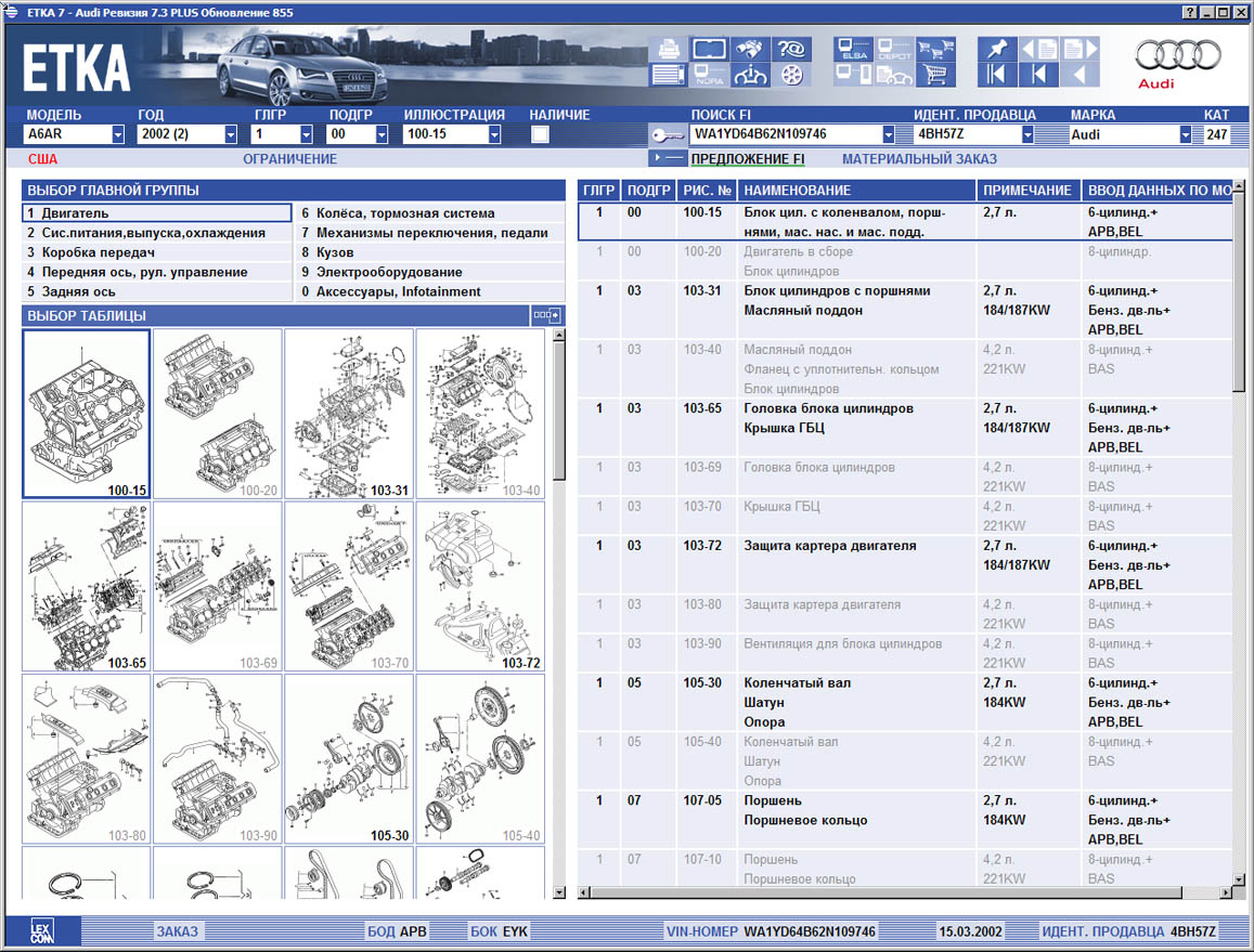 Каталог запчастей АУДИ (Audi), Фольксваген (VW), Skoda, Seat содержит каталог деталей и аксессуаров для всех моделей Ауди, Фольксваген, Шкода, Сеат выпущенных для европейского, американского, бразильского, китайского, мексиканского, южно-африканского рынков.