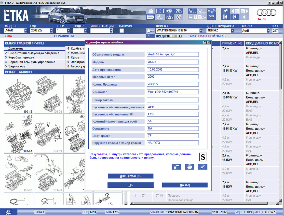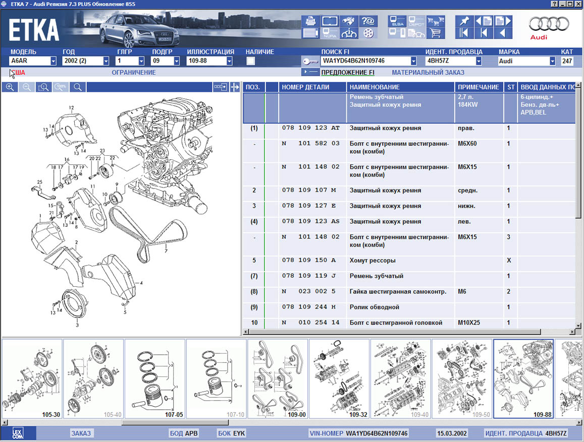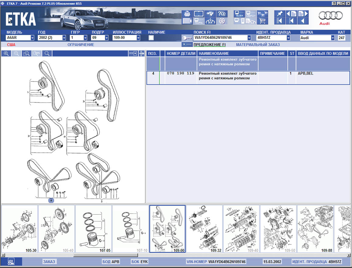 В программе ETKA каталог запчастей АУДИ, каталог запчастей Фольксваген, каталог запчастей Skoda, каталог запчастей Seat имеется функция поиска применения запчасти, она позволяет искать применение детали только по AUDI или только каталог запчастей фольксваген (Volkswagen), или по всему VAG сразу, а также информация относящейся