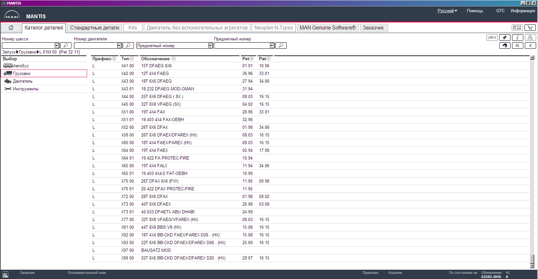 Каталог MAN MANTIS содержит весь перечень деталей для грузовиков Man, седельных тягачей Man, автобусов Man и различных шасси специального назначения, а также двигателях Man и трансмиссиях Doromat.