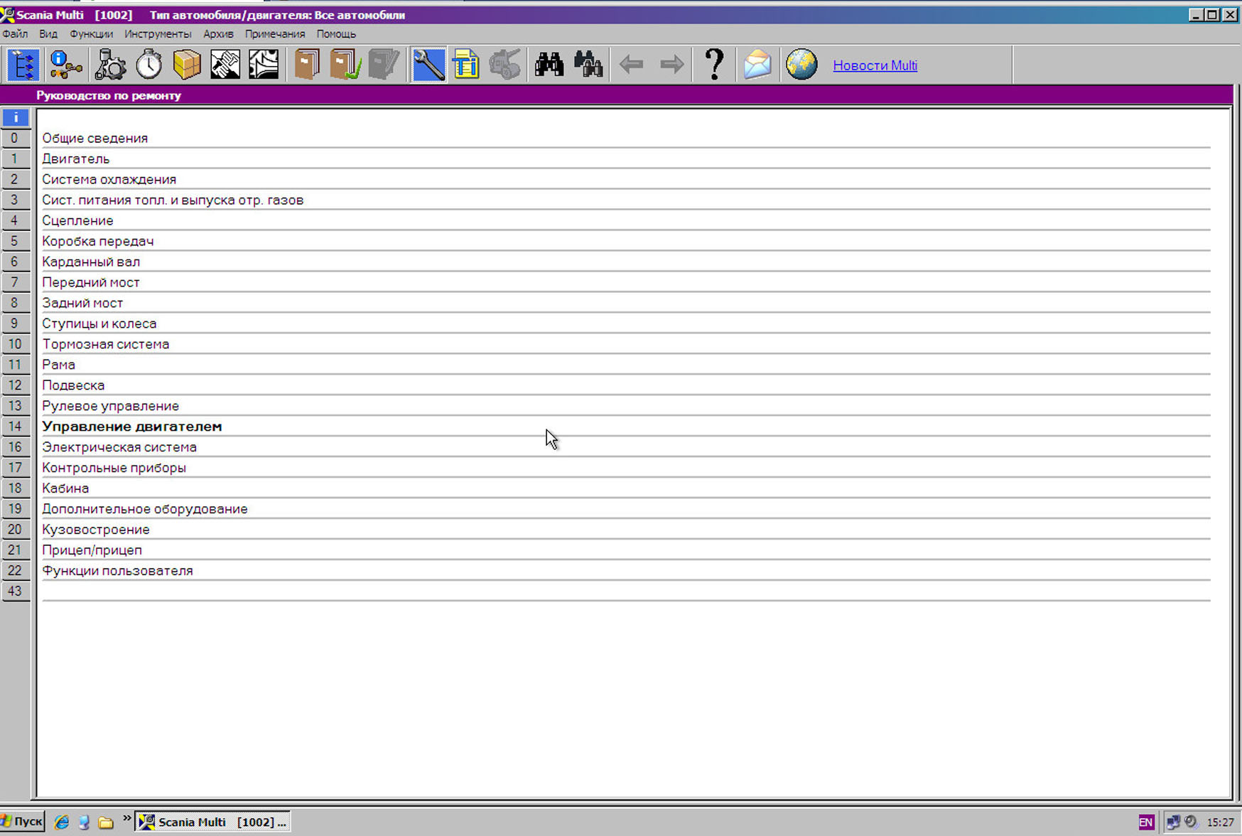 В каталоге Scania Multi по ремонту информация разбита на разделы, в которых вы можете найти информацию по типу автомобиля и двигателю.